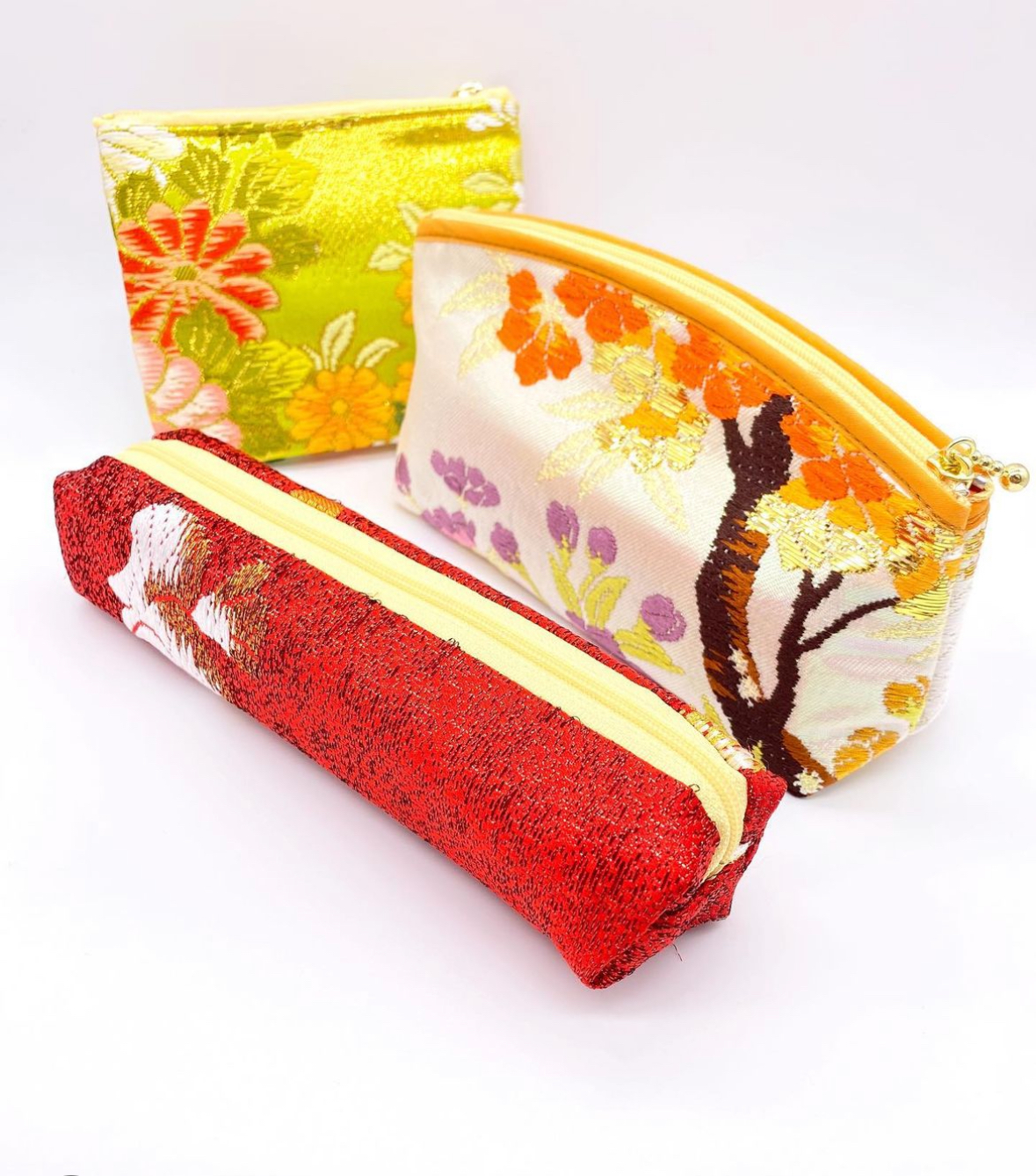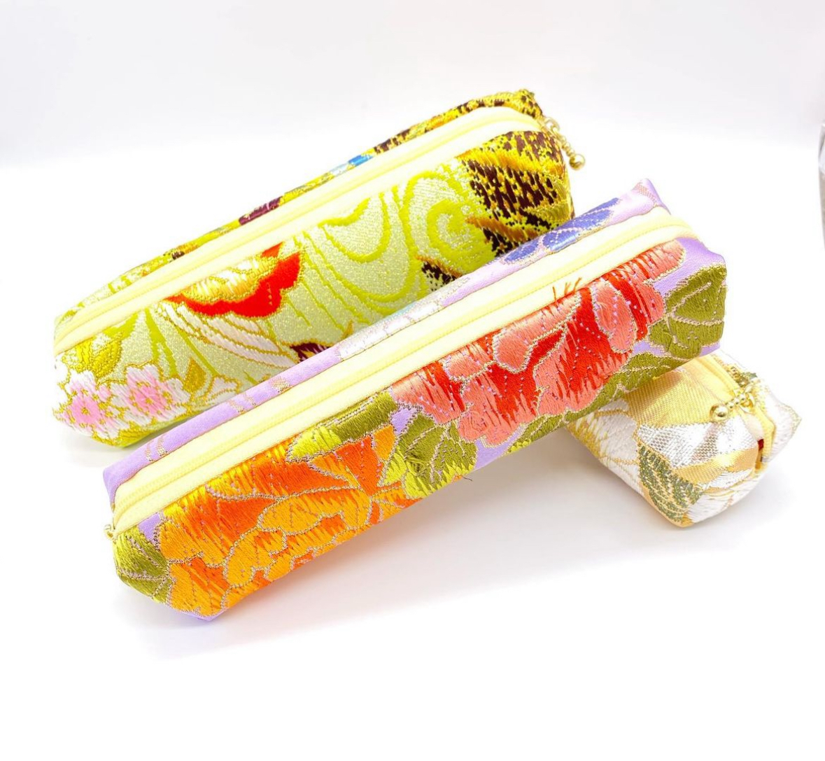 部屋を飾るインテリアとして海外のコレクターが購入する色打掛は弊社が京都で製造しています。色打掛の素材は絹糸と箔や金糸などが織り込まれている織物生地でとても高級品です。ヴィンテージの帯の額装は10年〜40年前に作られたもので、中古品です。帯は使用されていたので、汚れなどがあります。しかし現代と違ったデザインや配色の雰囲気が人気です。帯は約4mの長さがありますが切らずに、そのまま特注の額縁に入れていますので帯として着用も可能です。そして和雑貨は色打掛や帯の半端の散布を使用して作られています。